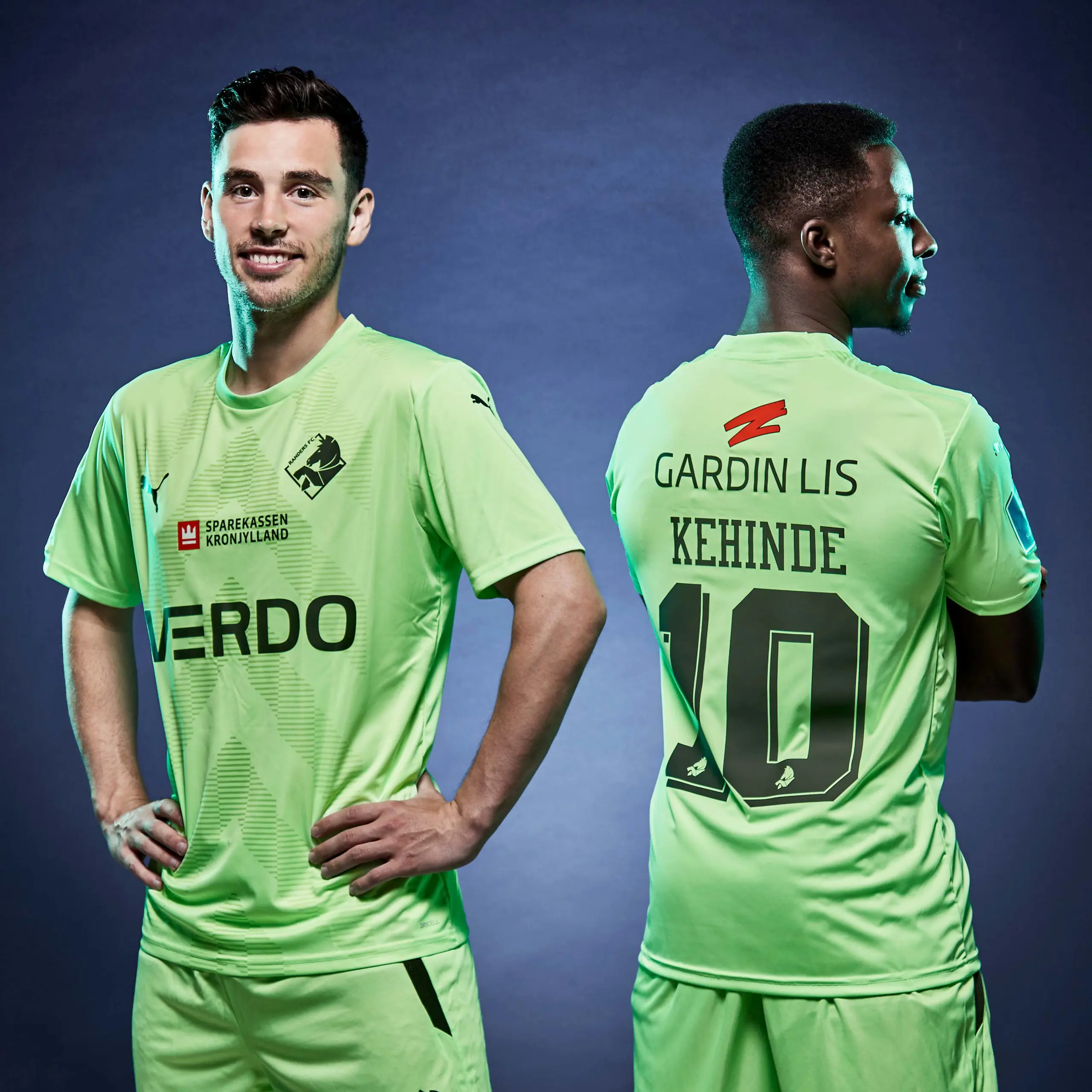 Nu skal Vito, Tosin og de andre Randers FC-spillere i aktion i grønt med Verdo og Sparekassen Kronjylland på fronten, Gardin Lis på ryggen og klodskassen.dk på shortsene.